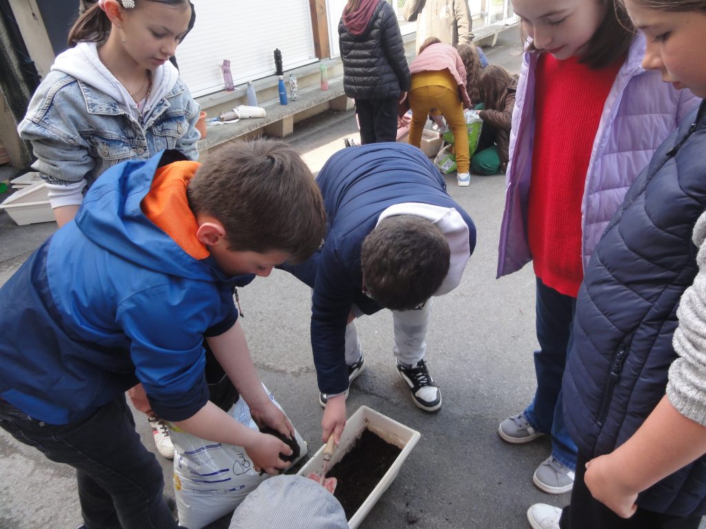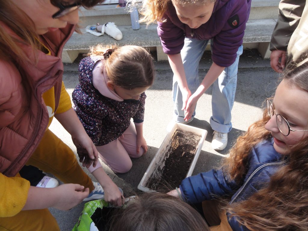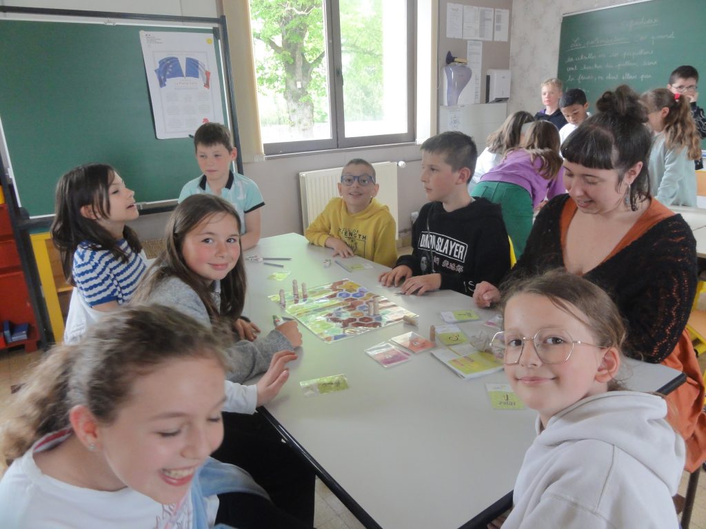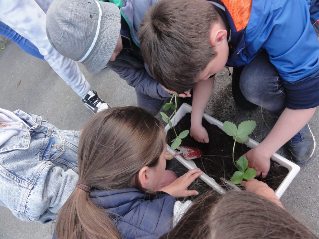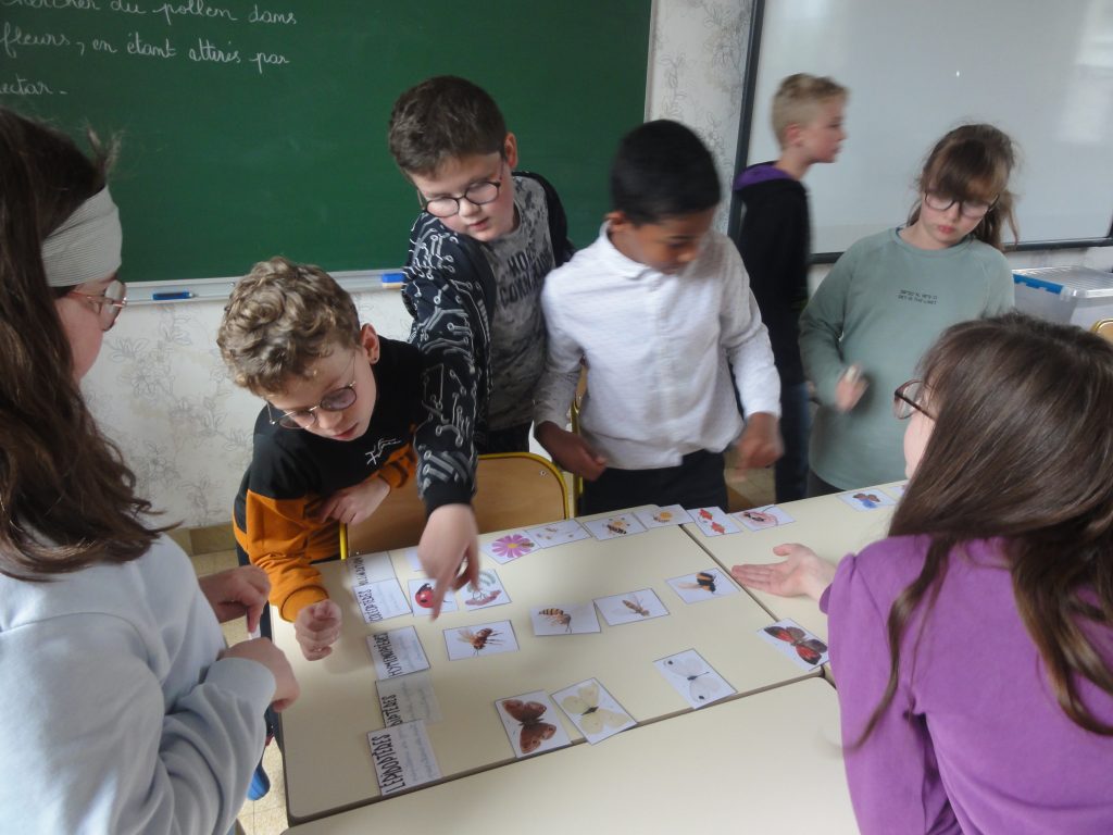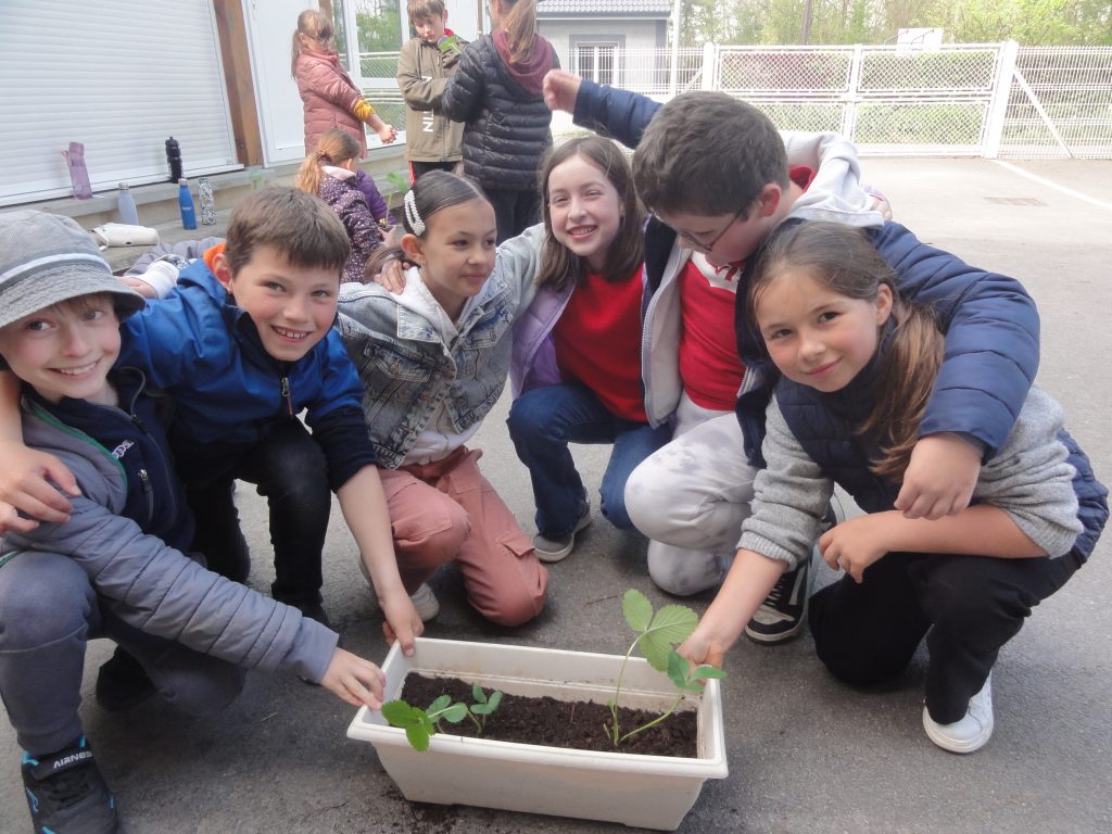 En classe, on reprend toutes les notions découvertes lors de la sortie par des jeux et des activités diverses, puis on organise notre observatoire de la biodiversité : on va essayer de bien observer et relever régulièrement tous les petits pollinisateurs qui vont venir visiter les fraisiers que nous avons mis à pousser dans des jardinières.