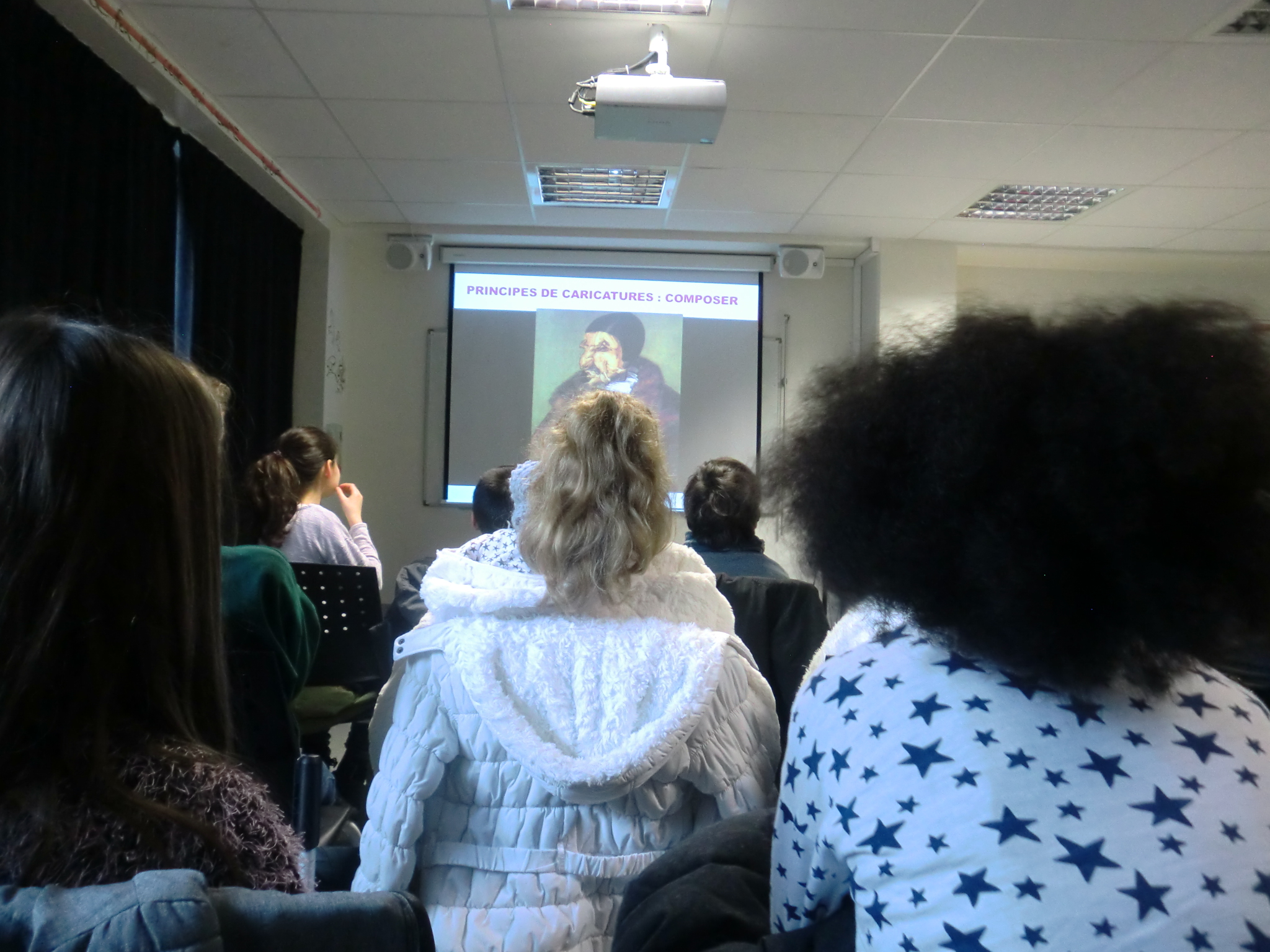 Mme Gimenez nous a montré des caricatures sur un écran et elle nous expliquait quel message on a voulu faire passer par certaines caricatures.