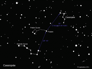 Nous avons vu, Cassiopée, la grande ourse, la petite ourse, le chasseur et pégase. Au bout de la petite ours se trouve l’étoile Polaire, beaucoup de navigateurs se sont repérés grâce à elle.
