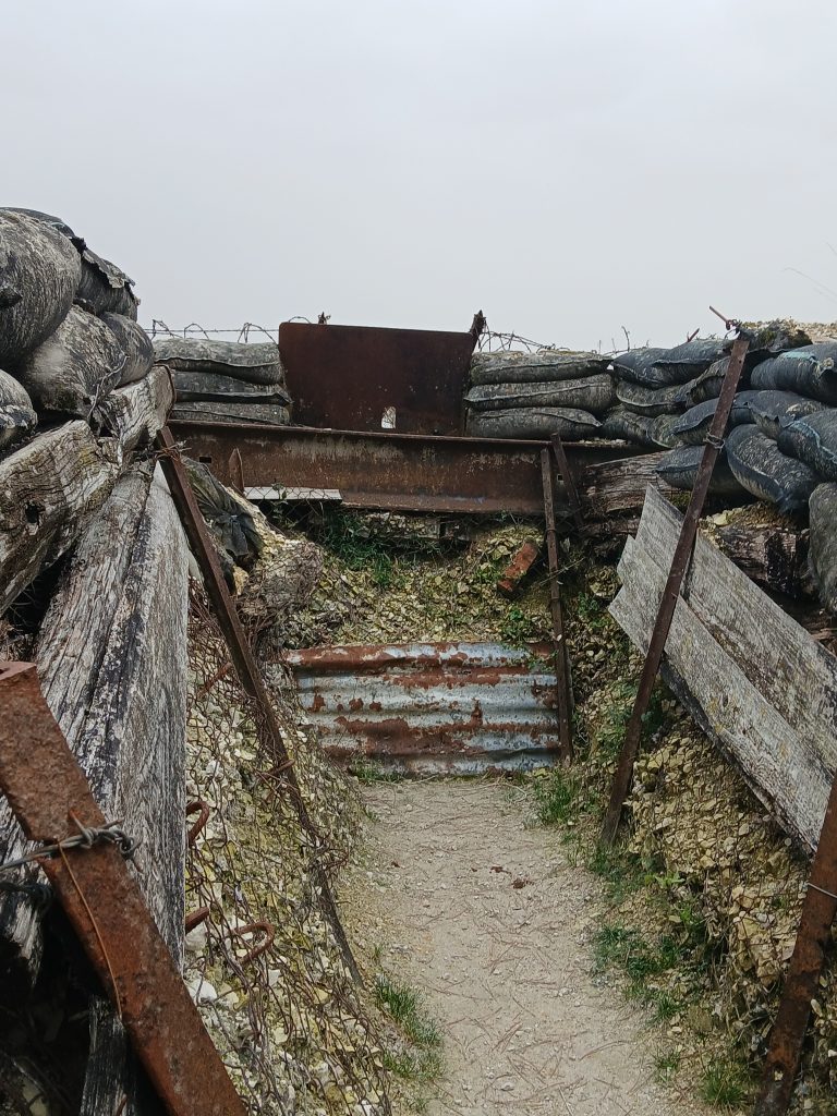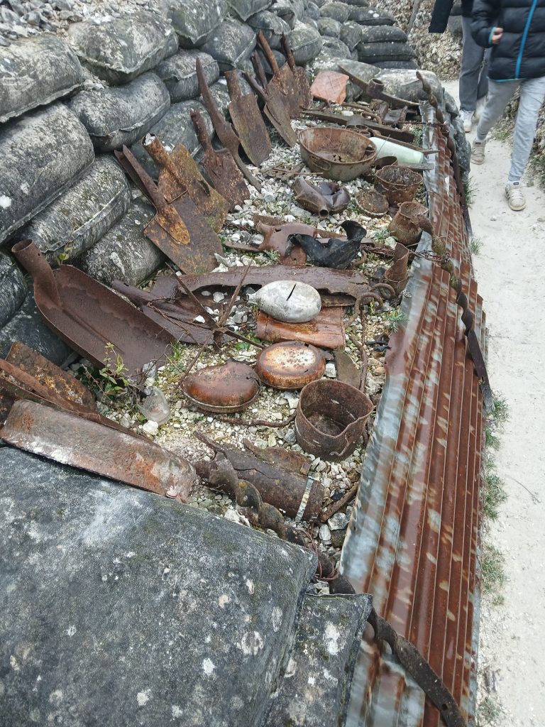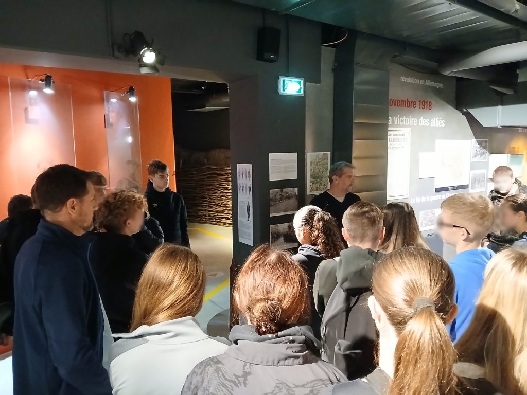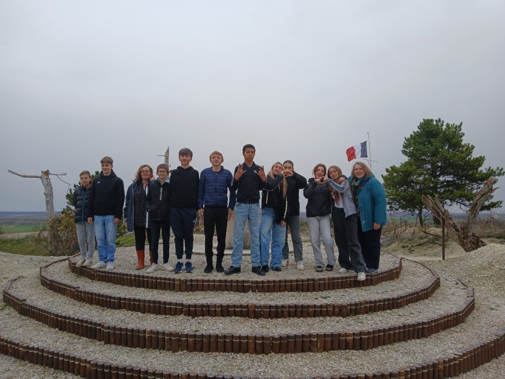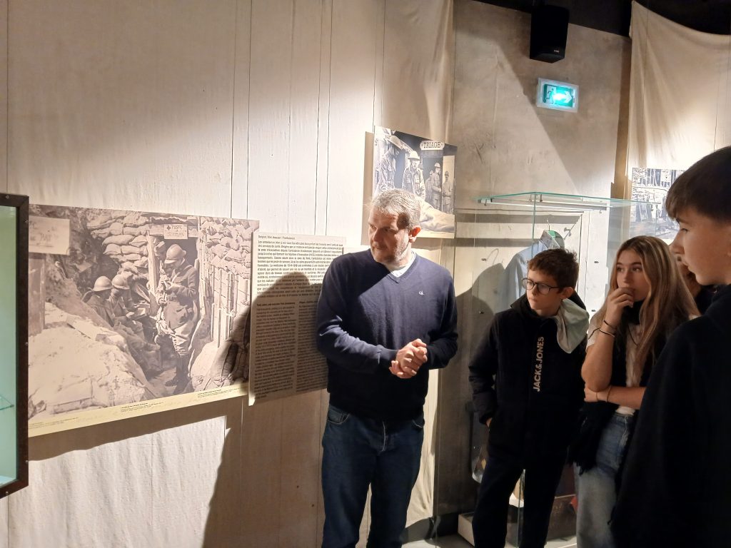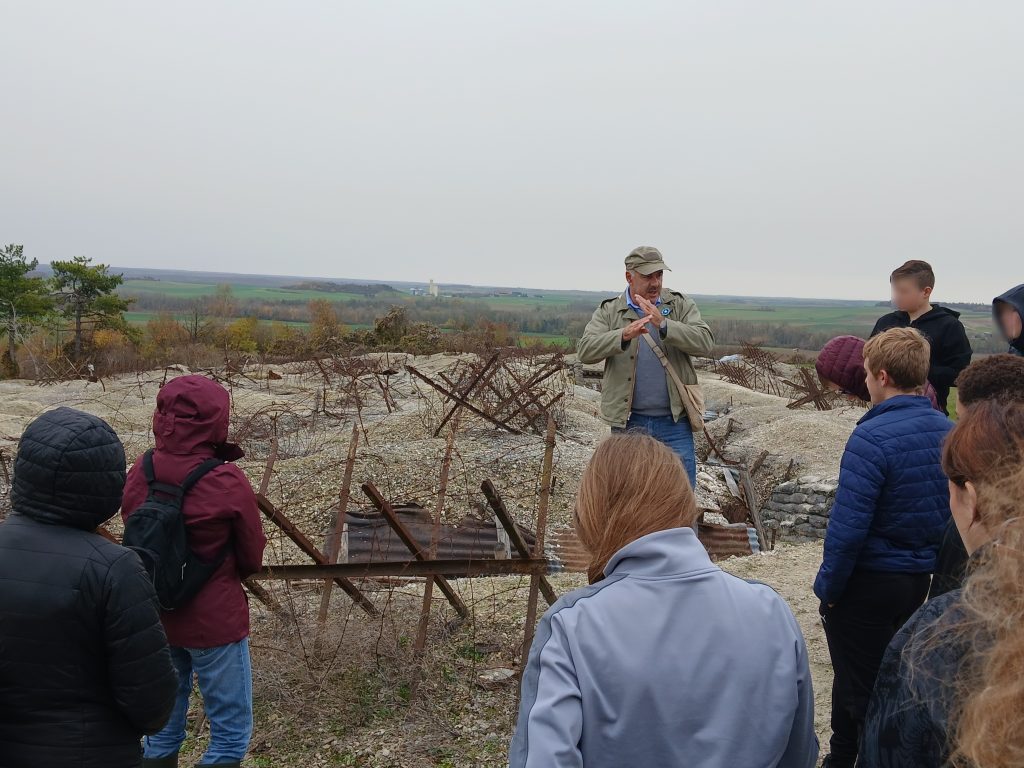 L’après-midi, ils se sont rendus aux tranchées de la Main de Massiges. Ce site doit son nom à sa topographie particulière rappelant les cinq doigts de la main gauche. Dans ce lieu de mémoire emblématique, les élèves ont été immergés dans la vie au sein des tranchées grâce au guide passionné et ont ainsi découvert une partie des 300 mètres de tranchées, occupées à tour de rôle par les armées françaises et allemandes et restaurées par une association.
