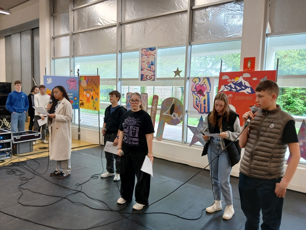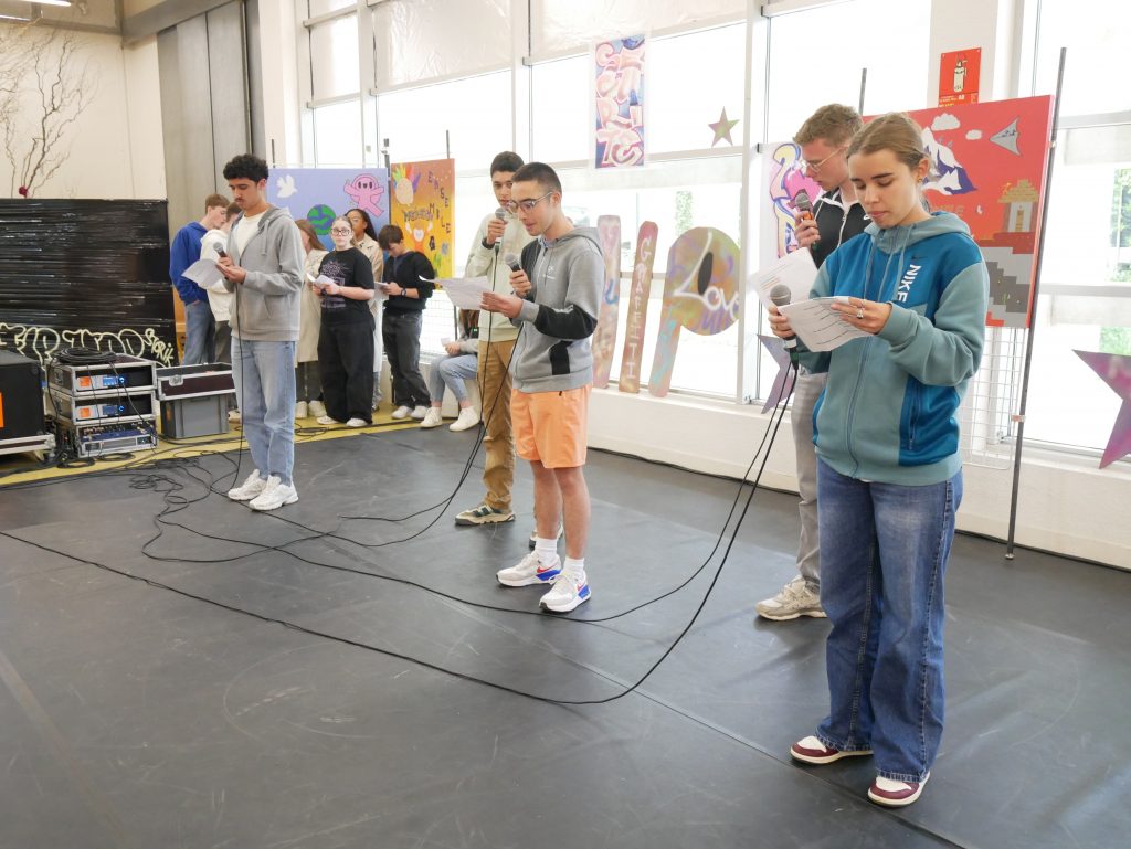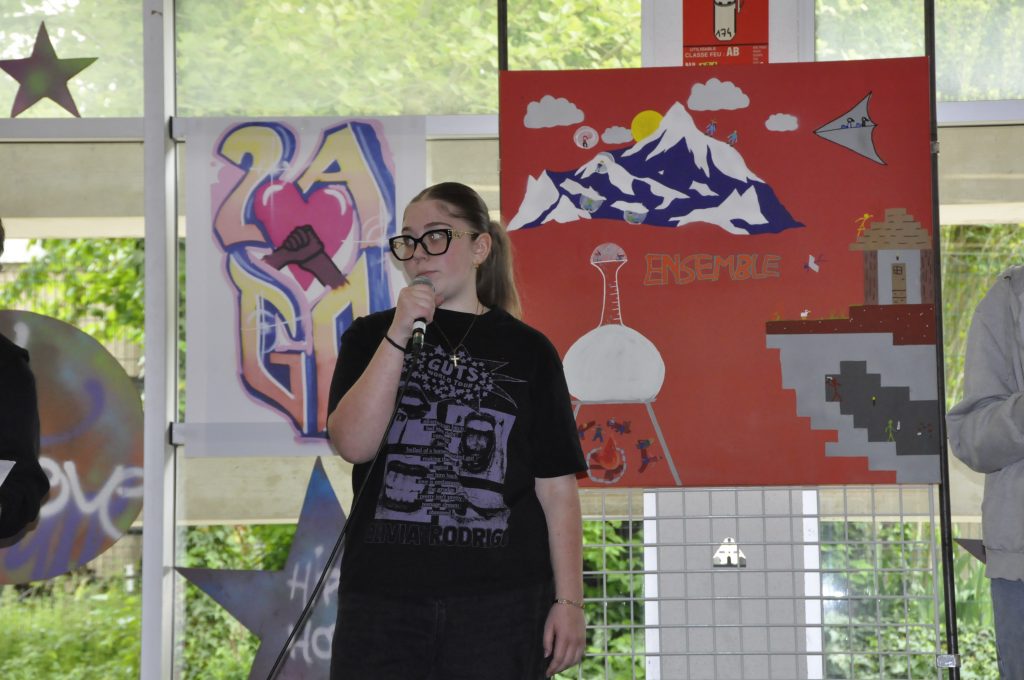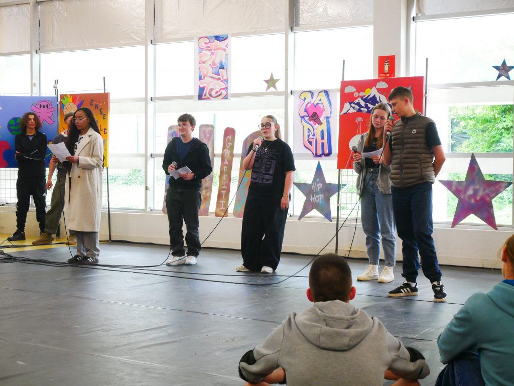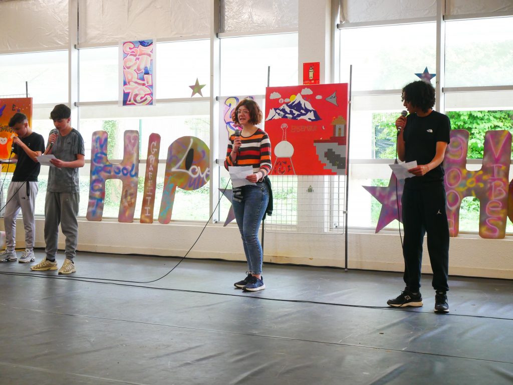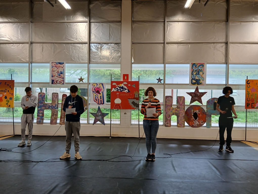 Ce vendredi, sonnait l’heure du spectacle sur le thème « Faire corps », concrétisation de ces semaines de travail pour les élèves et leurs professeures Elsa Maulion, Marion Parmentier, Camille Sirodot et Aurélia Wavelet. Aux côtés des lycéens d’Edouard Herriot et de Paul Verlaine, les élèves de Baudot ont réalisé de très belles prestations en slam et en hip-hop dans une scénographie construite à partir de l’ensemble des réalisations graffiti devant un public très enthousiaste. Les élèves ont fait preuve d’une grande implication et ont été ravis de cette belle journée de créativité et de partage.
