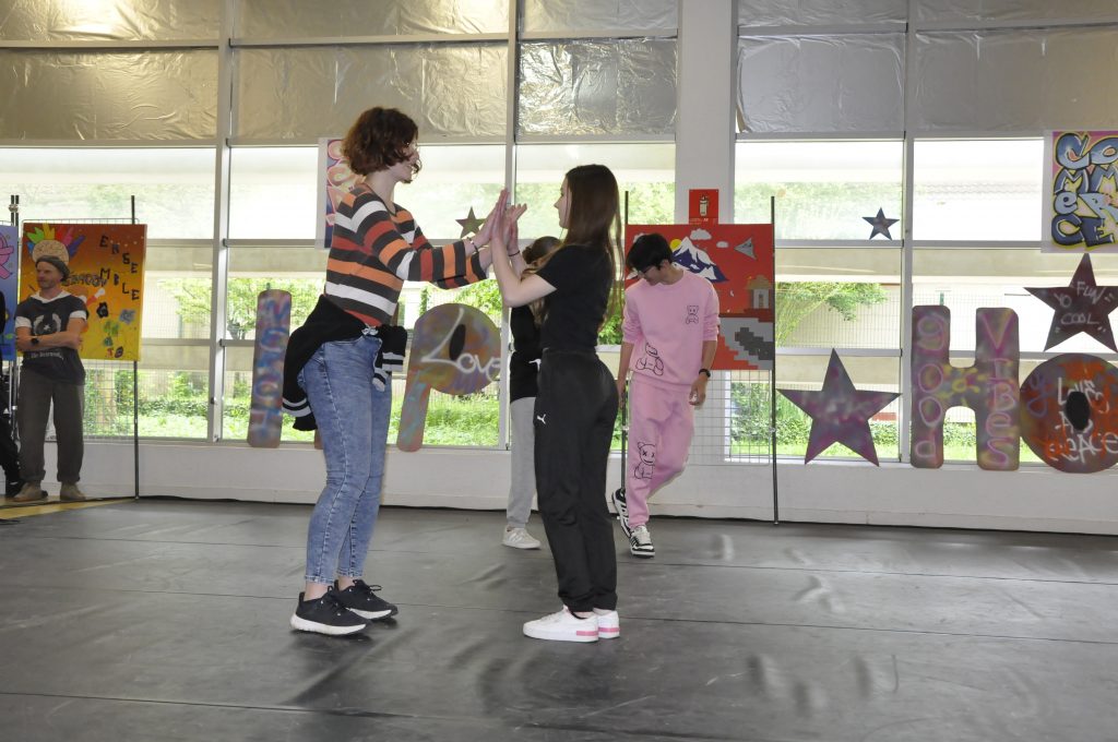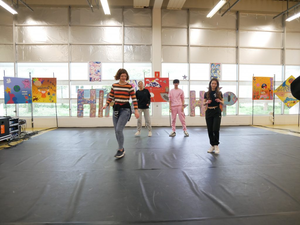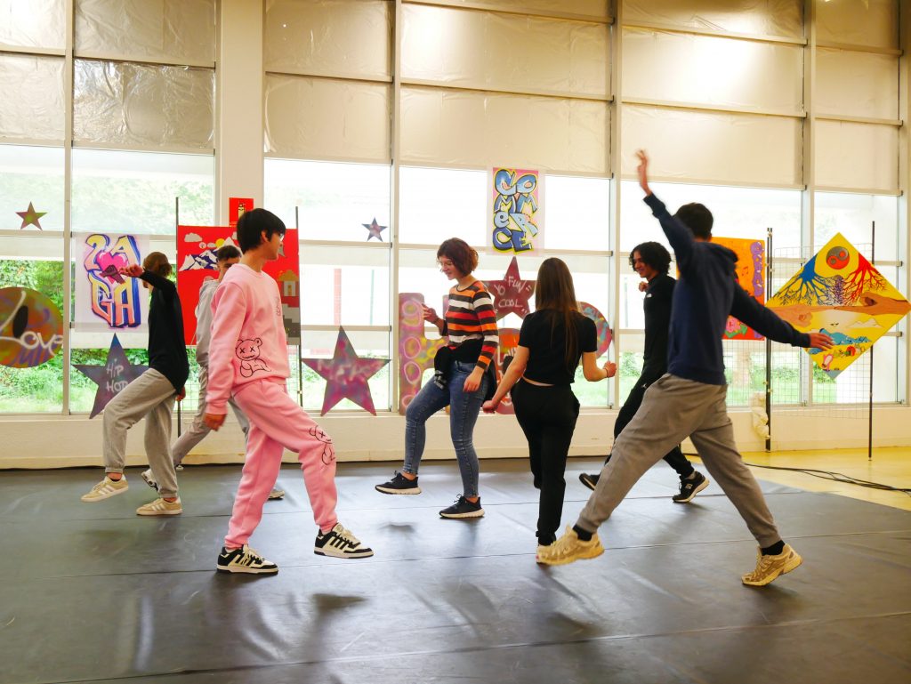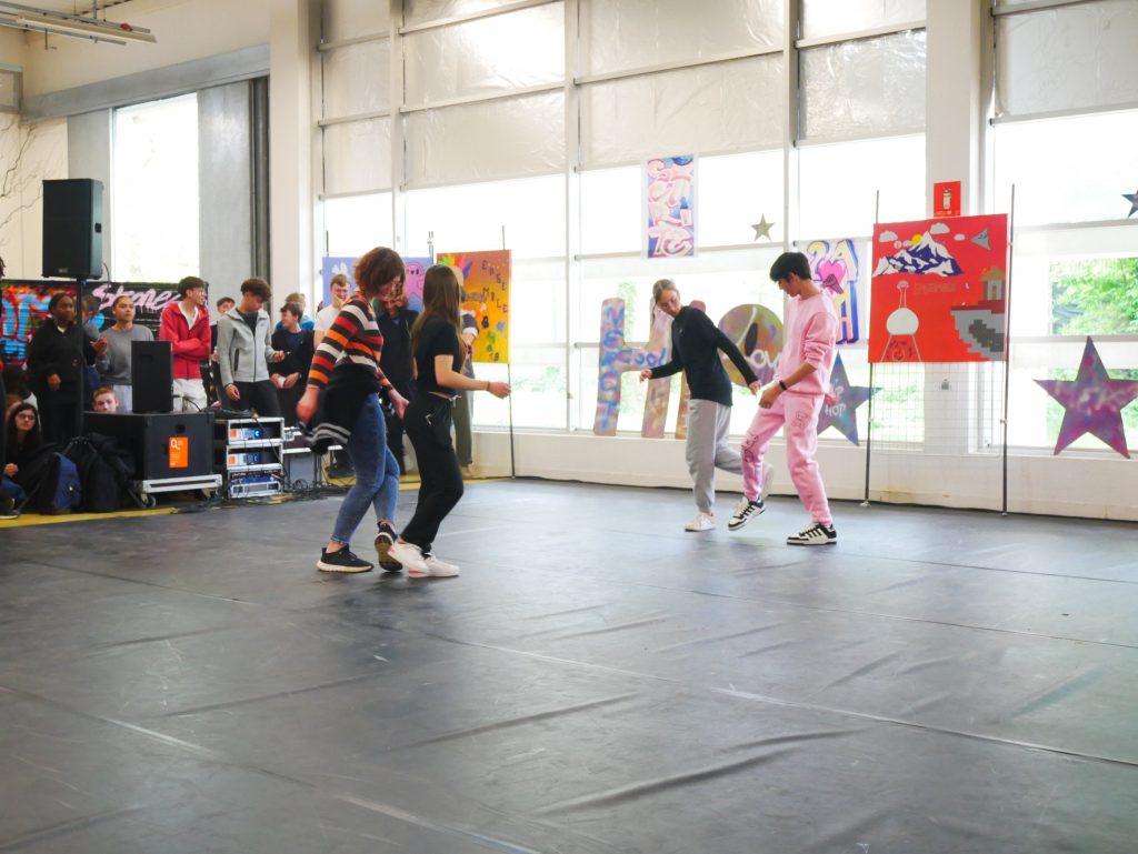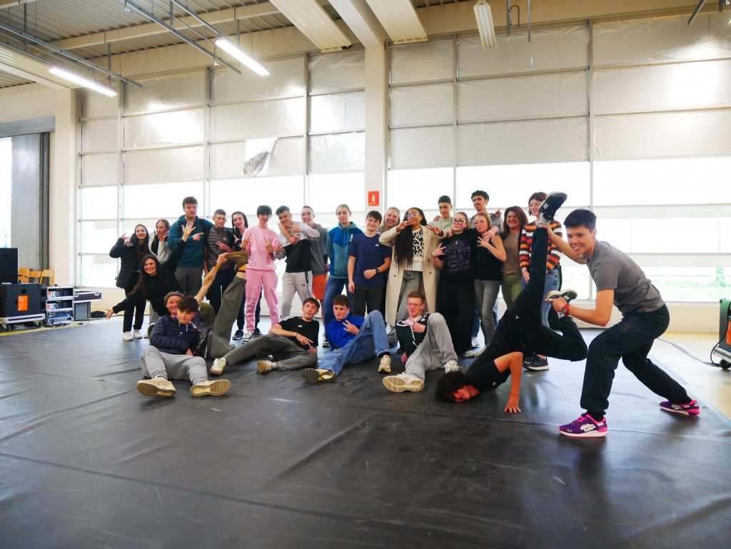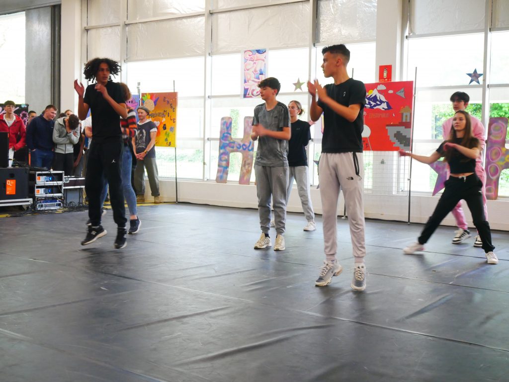 En cours d’EPS, les élèves ont été initiés à l’activité danse Hip-hop avec la danseuse Lucie Inglebert (cie Insomni’arts) pendant un cycle entier ce qui leur a permis de progressivement gagner en assurance face à un public.