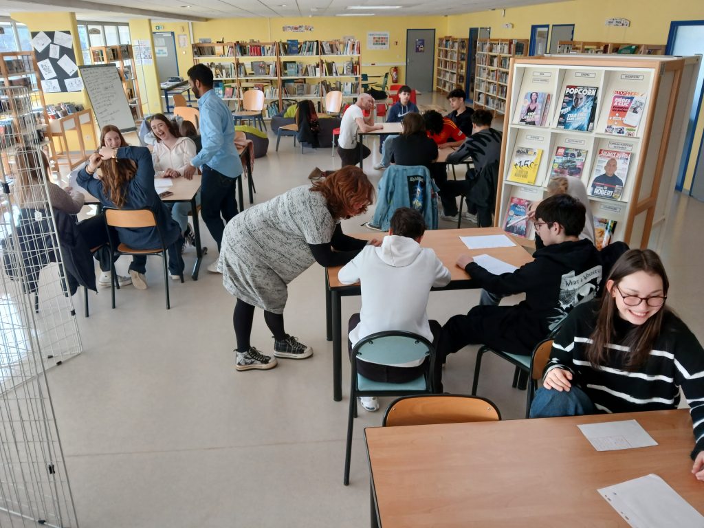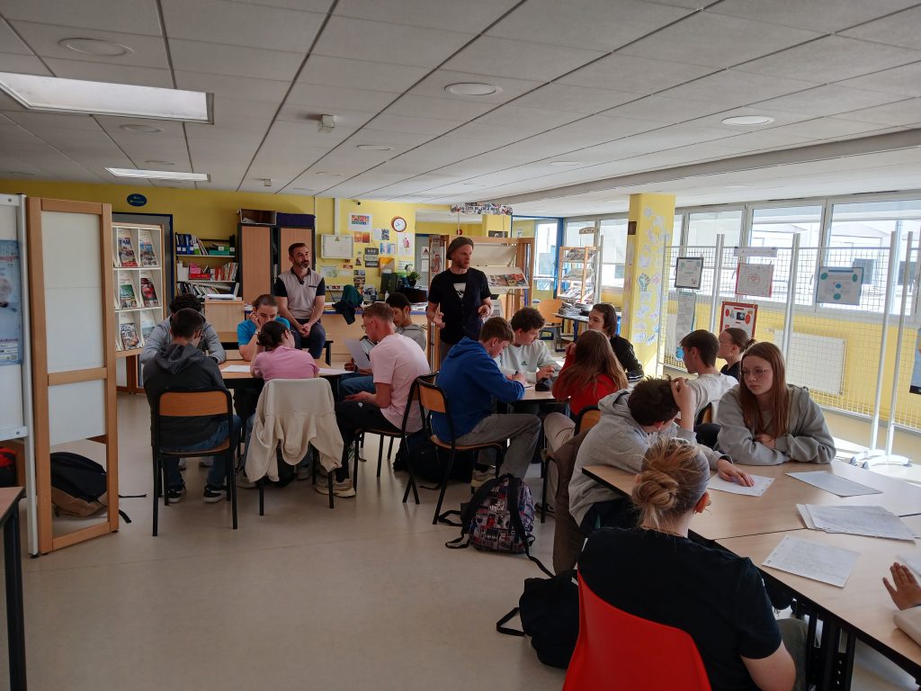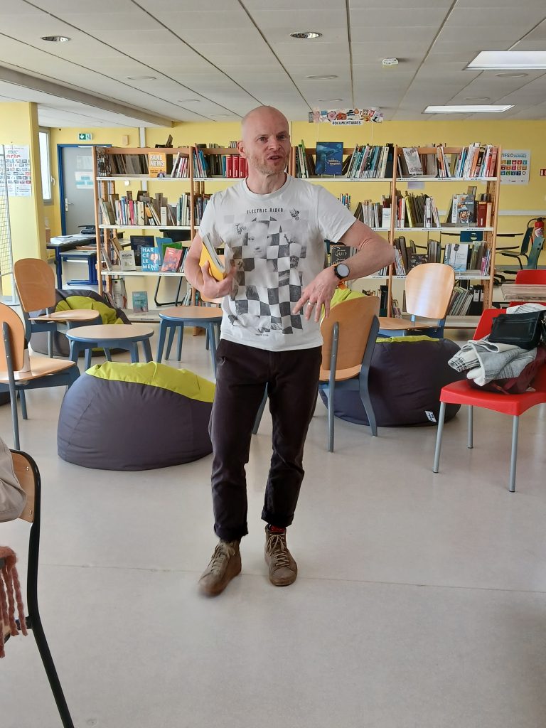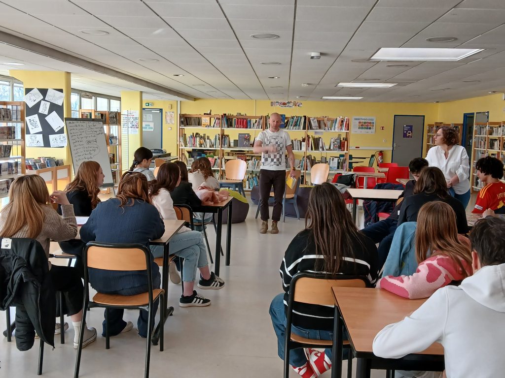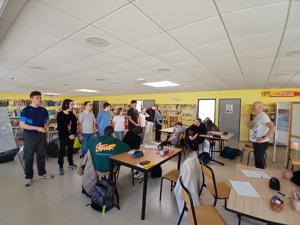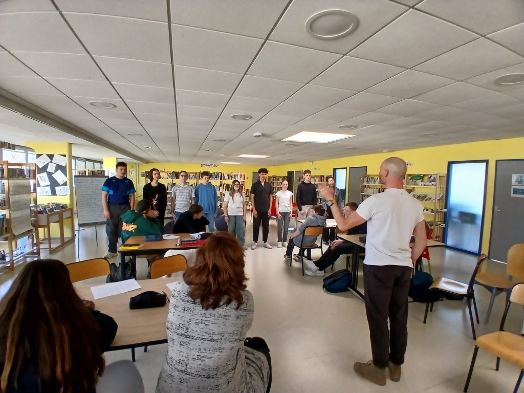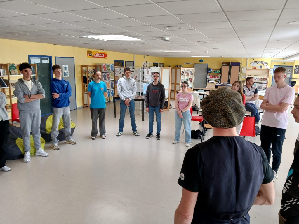 En français, les élèves de 2BPMS et de 2BPMRC ont découvert le slam grâce au slameur Damien Guillemin, alias « M’Sieur Dam » (cie Insomni’arts). Outre la pratique d’exercices d’oralité et de pose du regard, les élèves se sont lancés dans l’écriture individuelle de slams à partir d’expressions françaises avec les parties du corps avant de se réunir par groupe de six et d’expérimenter l’écriture collective. Lors de ces ateliers et pour le spectacle, ils ont écrit et préparé des textes percutants et émouvants.